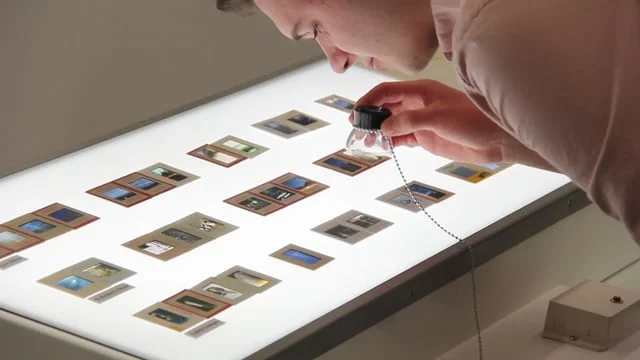 This piece uses damaged slides excerpted from a collection inherited from Cornell University ecology professor, Dr. Richard B. Fischer. They are laid out on a light table as they would be on a filmmaker’s storyboard, in three rows, each row associated with a character. The accompanying audio presents letters, written between these characters, read in the voice of each. The letters spell out a story in which mysterious photographic errors, visible on the slides, are determined to be messages from Planet Earth, asking the characters to act as emissaries begging humanity to treat it more gently.
